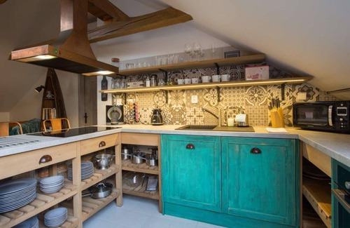 Immerse yourself in this peaceful designer space located a stone's throw from 700 years of European culture and history. Exposed beams and bricks, hanging plants, and industrial-chic metal chairs create a stylish, bohemian ambience.