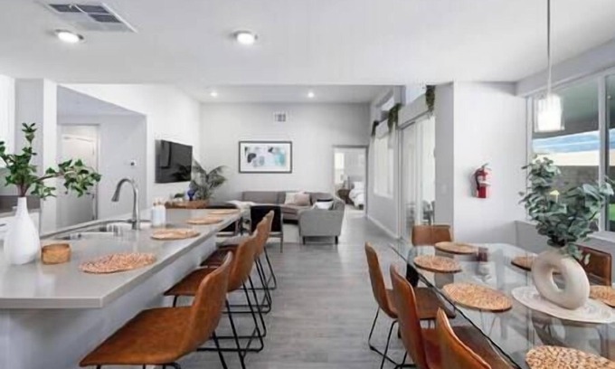 Newbuild modern luxury home! This 4-bed, 3-bath oasis features a climate controlled salt pool, hot tub, sunken fire pit, Casita, outdoor BBQ, putting green, and cornhole. Perfect for relaxation and family fun. We are excited to host you and your group!
