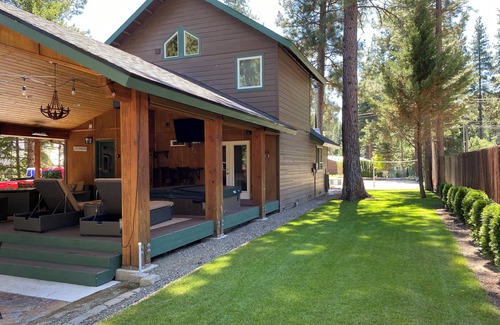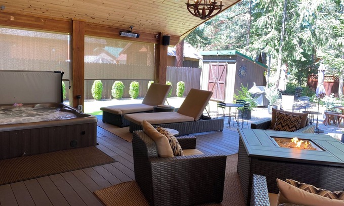 Amenities for this RV camping space include: covered parking, 30 amp electric, water, covered deck with hot tub, dry bar, fire table, 65 inch TV, lounges, Bluetooth speakers, and heaters. Sport court with badminton and tether ball. Grass area for bocce ball and croquet. Two patios with Adirondack chairs, tables and chairs, lounges, picnic table, herb garden, grill with all supplies, fire pit (except during burn ban). The RV only location is in the Ponderosa neighborhood. Please review the cancellation policy before booking. It is firm, no exceptions! No additional people may be on the property at any time.
