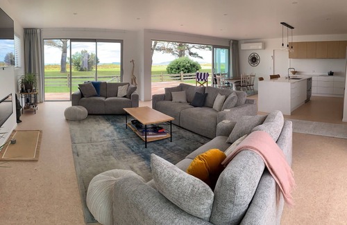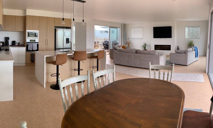Newly built beachfront home. 3/4 available bedrooms, would suit family up to 8 people. Plus there is a porta cot available and a range of children's toys and books. Light and spacious with the beach 1 minute away. Open plan living down stairs with separate laundry handy to clothes line and outdoor shower. Two decks, north or west facing depending on the weather. Off street parking.