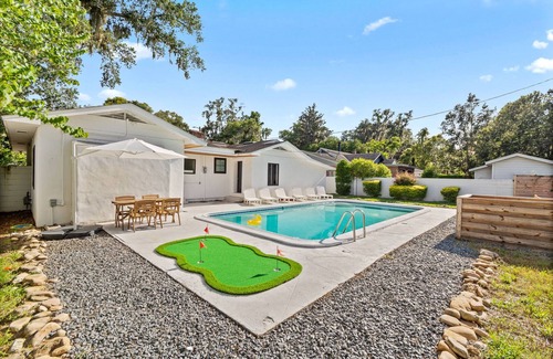 Welcome to The CHOMP HOUSE—a one-of-a-kind, game-day-ready retreat in the heart of Gainesville, FL! Just steps from the University of Florida campus and Ben Hill Griffin Stadium, this spacious home sleeps up to 16 guests and is packed with entertainment—from an in-ground pool and indoor basketball, to mini golf and more. Whether you're visiting for a football weekend, graduation, or family getaway, this home is built for unforgettable memories.