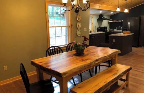 Our house is a newly renovated cabin that doesn't look or feel anything like the original structure which was built in the 1940s. The kitchen is fully equipped for preparing delicious meals. Coffee and tea are provided. Each of the three bedrooms has a queen-size bed and bath. The great room is spacious and comfortable. Nestled in the woods, the location is private, yet provides easy access to wonderful restaurants, shops and numerous state parks, national forests and other outdoor activities in the Upstate and Western NC.
