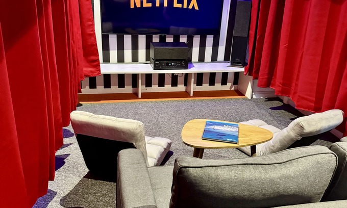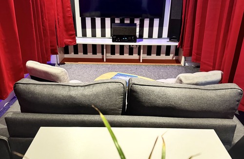 Warm and comfortable, it offers a spacious bedroom with a double bed and a desk for work, a living room with a convertible sofa bed perfect for movie nights with LED ambiance, a large 4K screen, immersive 5.0 sound, and a equipped kitchenette.