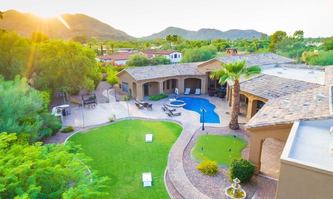 Elegant Desert Estate with Pool, Theater & Mummy Mountain Views Welcome to an extraordinary escape in the heart of Paradise Valley. This expansive 8-bedroom, 6.5-bath villa blends timeless Tuscan architecture with refined Arizona luxury. Perched beneath the iconic Mummy Mountain, the estate offers panoramic views, serene surroundings, and every amenity needed for a memorable group getaway.