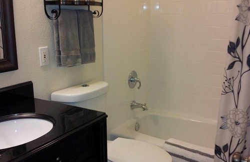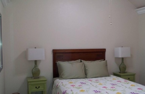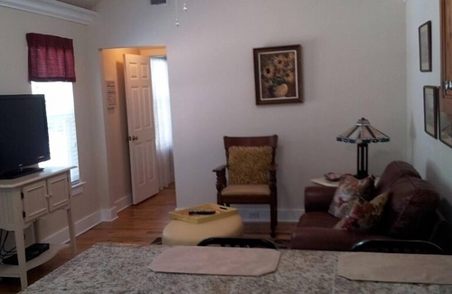 One bedroom cottage comfortably furnished with a queen, Beauty Rest mattress , down pillows, high thread count hotel sheets, and ample closet space. Additional sheets and blankets are in the antique chest. Off the adjacent hallway you will find a nicely appointed full tile bath/shower. Hair dryer, shampoo, hair conditioner and towels are provided. The living area is a great place to relax with a very comfortable leather couch, flat screen TV with cable and internet. The eat in bar top full kitchen is adjacent with all appliances including washer and dryer, dishes, silverware, spices ready to make a meal or enjoy a restaurant seconds away.