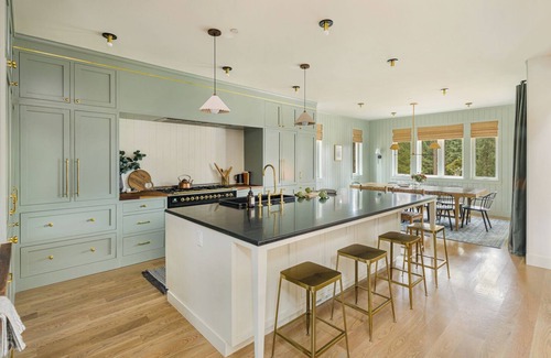 The fully stocked custom kitchen is ready to provide you everything you will need for fantastic family dinners, holidays, or feeding a large groups. Boasting floor to ceiling cabinetry, fully integrated appliances, soapstone counters, three dishwashers, 2 ovens, + an oversized island prep area with seating for 8. The dining table is just steps away and it seats 10 to 12 comfortably.