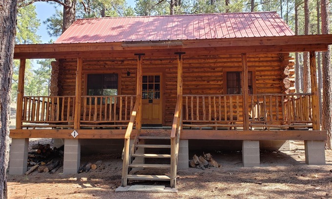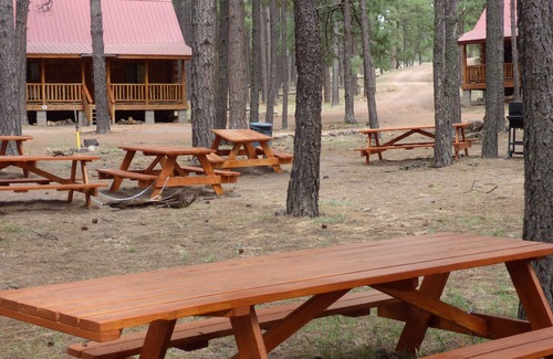 Eight beautiful handcrafted REAL log cabins nestled in the mountain pines. Each cabin has a full kitchen, bathroom with a shower and a sleeping loft. A cozy wood-burning fireplace/stove enhances the "real log cabin experience". Sit on your large front porch and watch the elk wander through the pines, meadows and hilly rock outcroppings of our 25 acres. A large group picnic area is centered in the circle of cabins and each cabin has its own BBQ grill. Luna Lake is only 1.3 miles away, with Big Lake, and Nelson Reservoir close by for all your hiking, boating, and fishing needs! Hunters have access to one of the best elk hunting grounds in Arizona! Easy access just off of Highway 180. Great for a weekend get away, family reunion, or a "Wedding in the Woods"! Cabins can sleep UP TO 5-6 persons, prices will vary. Queen and twin beds available. Come relax, breathe our fresh air and rejuvenate yourself!