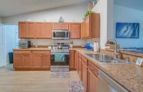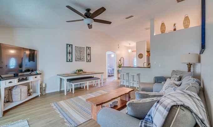 INDOOR LIVING: Smart TVs, board games, books, dining table, updated interior, beachy decor, breakfast bar w/ seating