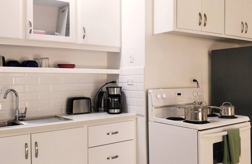 The kitchen is equipped with a freezer, as well as a coffee maker, an electric kettle, and cookware. And you won't have to pack extra clothes, because you'll also have a washer/dryer.