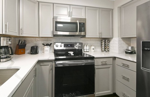 This relaxed and warm space is the perfect gathering spot for groups of friends and families. With 2 bedrooms, there is plenty of room for everyone to spread out and then come together in the cozy common areas. One large sectional and another comfy sofa sit in the living room facing a T.V and fireplace—perfect for a movie night! Under the archway, you'll find a kitchen equipped with upgraded stainless steel appliances, sleek white cabinets, and a roomy refrigerator.
