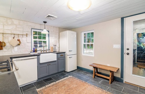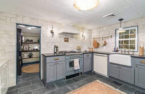 Thoughtfully updated kitchen with farmhouse sink, modern appliances, and cozy dining area