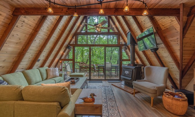 This chalet comfortably accommodates up to 8 guests with two bedrooms and one bathroom. The unique a-frame structure is outfitted with vaulted ceilings and a wall of floor to ceiling windows providing stunning views of the outdoors throughout the home. The open floorplan features a spacious living area with a wood burning fireplace, over-sized furniture, dining area, and sliding glass doors leading out to the expansive deck over-looking the lake. No need to pack cooking utensils, as our kitchen is fully equipped and ready with everything you need for breakfast, lunch, and dinner.