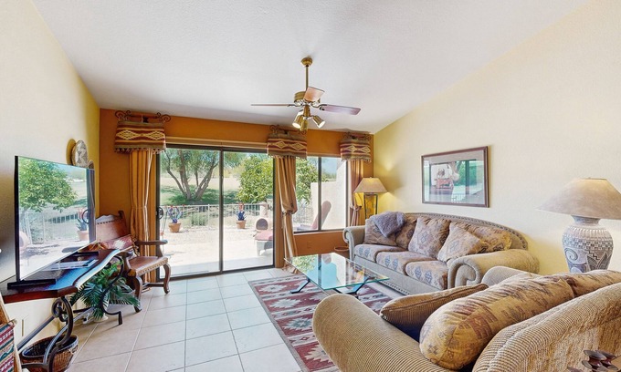 The condo's interior is warm and inviting with Southwestern decor. The living room boasts comfy furnishings, a flatscreen TV with Sling TV and an Amazon Firestick which guests can use to access their own Netflix and Amazon accounts to stream shows & movies and sliding glass doors that lead to a private, furnished patio. Dine al fresco and enjoy the delicious meal you made in the full kitchen while you revel in the sun's warmth. If you want to beat the heat, the central AC has you covered. You'll also have free WiFi and a private washer/dryer for even more convenience.