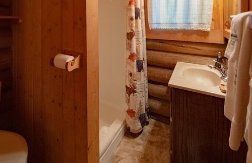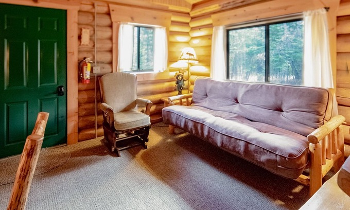 Bear's Den greets you with an abundance of character as soon as you step through the door. Find bear-themed accents at every turn, from the textiles to the artwork to the lamps that illuminate the space. Curl up with a good book on the futon (which doubles as an extra sleeping space), set up a card game at the dining table, and fix some hot cocoa and popcorn using the mini-fridge and microwave (please note, however, that there is no kitchen).