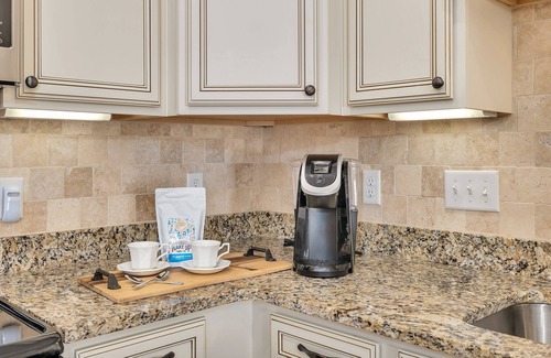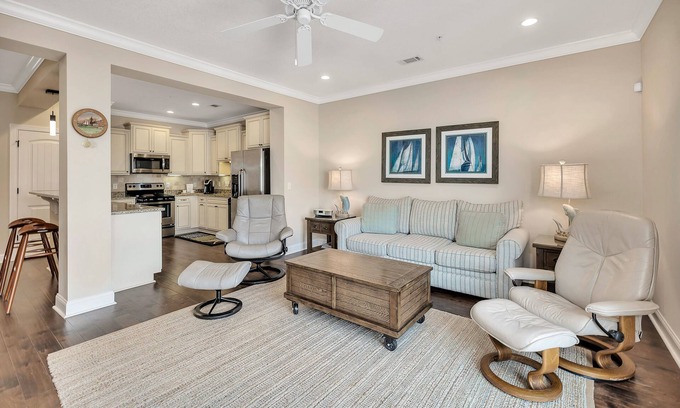 The town home is the definition of classic seaside style. Coastal details include wood floors throughout, a classic, calming color scheme with comfortable furnishings. The front entry hallway features a washroom for convenience and two closets to hang items or kick off sandy shoes. The main level has an open living and kitchen space as well as a dining table to seat 6. The kitchen features stainless appliances, plenty of counter space and beautiful deep sink, making for a pleasant cooking space. A small patio area located off of the living area is the perfect quiet spot to catch up on afternoon reading.
