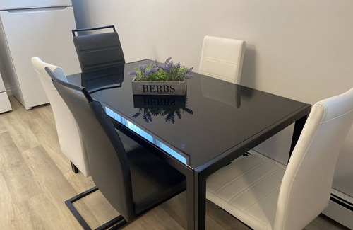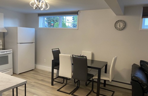 This newly renovated lower level apartment is fully furnished with all brand new furnishings including king size bed. Parking is protected by lights and video. Private keyless entrance. Only a 5 minute walking distance to groceries stores, Tim Hortons, Bakery, Pharmacy, Dentist, Good Life Fitness and Restaurants. We have a 24 hour variety store located at a 2 minute walk which serves fast food. Our hospital is only a 5 minute drive.