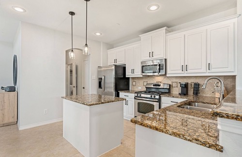 Kitchen and Dining: The fully equipped gourmet kitchen features granite countertops, stainless steel appliances, and a stocked Keurig coffee bar. The adjacent dining area comfortably seats your group and enhances the ease of your stay.