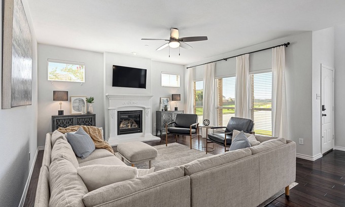 Living Spaces: This home offers two separate living rooms, each outfitted with a smart TV and comfortable, designer furnishings providing flexible spaces for relaxation, work, or entertainment. The main floor’s open-concept design includes large windows and a cozy fireplace, creating a warm and inviting atmosphere.