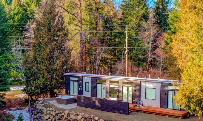The cabin features high ceilings, a gas fireplace, a gas range, and high-end kitchen appliances. The contemporary bathrooms are adorned with tile and glass. The OLED TV has Netflix, Amazon Prime, Airplay, and Miracast. Feel free to use a Tesla charger located in the parking area.