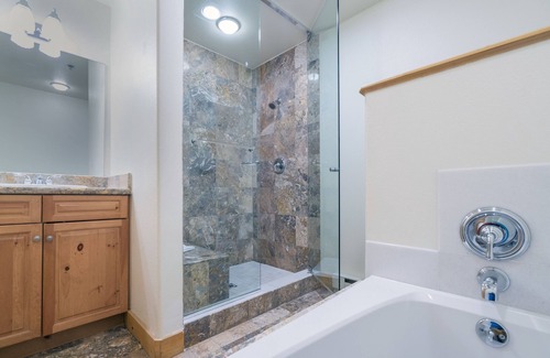 Guests enter this lock-off hotel room from the second floor of the Bear Creek Lodge. The main room has a king bed, flatscreen TV, small vanity area, and a microwave, mini-fridge and coffee maker. The ensuite bathroom has a separate jetted tub and step-in shower.