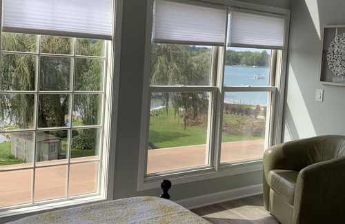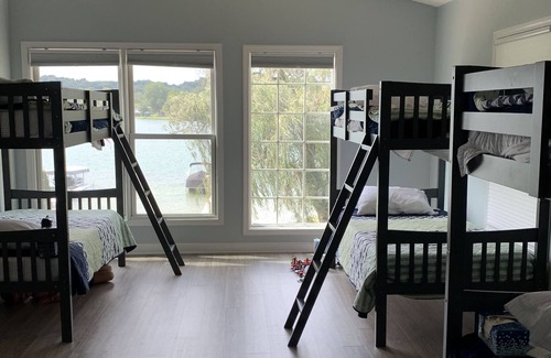 Our home was designed for 3 families to enjoy. The main level includes a living area with leather couch and 60" TV, the master bedroom with King size bed and ensuite with stand up shower, Bunk Room with three sets of bunk beds (6 twins total) with access to the Jack and Jill full bathroom with stand up shower and a third bedroom with full size bed that overlooks the lake.