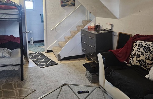 This room has a Sofa, Smart TV, Twin Bunk Beds , attached 1/2 bath, A Dresser, Tables, board games. This lower level walks out to the attached patio for smoking, working or relaxing.
