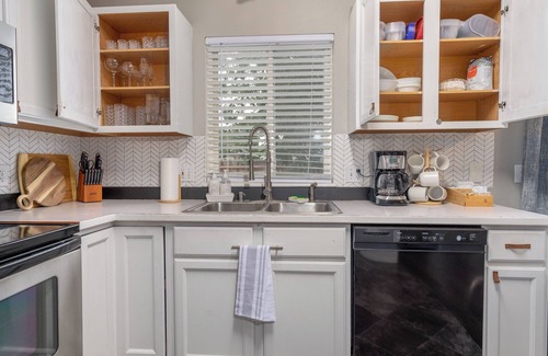 • Hand mixer, toaster, hot water pot, crockpot, blender, 12-cup drip coffee maker, ground coffee, coffee filter, large selection of Pyrex bakeware, Cuisinart stainless steel cooking pots, Wilson backing trays, and wide selection of glassware and bartending tools.