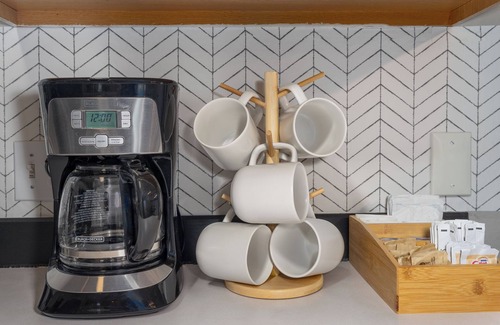 • A variety of Tazo tea, hot chocolate packets, and liquid and powder coffee creamer
