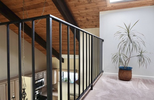 The loft has two floor couches that fold out to futons. There are weights, a resistance band, yoga mat and natural disinfectant for after use.