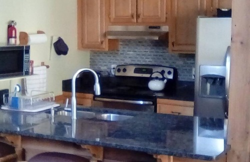 This home is part of a duplex facing Clear Creek. It includes a front and private back patio surrounded by pine and aspen. The backyard patio is covered by a Pergola, the patio is large enough for socializing and enjoying the summer weather. Interior includes a large living room (with a fold-out sofa bed ), a fully equipped kitchen and dining area, and two bedrooms with Queen sized beds and an accompanying bathroom on the ground floor. The second floor consists of an en-suite unit with a large living room/bedroom, a full sized bed, a queen size bed, a full size cabinet bed, a TV and a fireplace. There is also a large remodeled bathroom with a shower and a soaking tub.