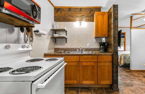 Hideaway Resort is located on the James River arm of Table Rock Lake between points 11 and 12. Although the resort is not located in Branson, you are just a 35 minute drive away from everything the area has to offer. Clear Water Cabin, #3, has been recently updated and has amazing views of the lake - right across the street! The cabin is a studio layout, with a living area, kitchen area, and a bedroom seperated by a divider. The living room has a comfortable couch that doubles as a queen size sleeper sofa. The unit also has a flat screen TV with satellite. The kitchen has everything you need to make your families favorite lake meal. This cabin's bedroom, seperated by a divider, adjacent to the living room and features a new queen mattress. Walk to the resort pool or across the street to the resort dock. There are shared charcoal grills just steps away from the unit.