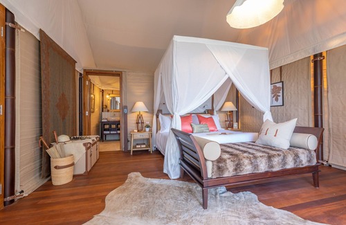 Escape into the luxury of another time and place at this romantic African safari-inspired tented lodge. With two master bedrooms, each with an identical ensuite, it perfectly suits two couples on vacation together. Situated at Andersons Cove with sweeping clifftop views over Bream Bay in Northland, New Zealand, this luxe lodge has all the mod cons including full kitchen, concealed TV and satellite wifi but thanks to solar power it is completely off grid. The huge deck incorporating several seating areas, cedar hot tub and Weber BBQ has room for outside clifftop dining, while the hidden bath is a treasure. Situated on a 40 hectare /100 acre coastal farm running sheep and cattle close to Te Arai, Mangawhai, Langs Beach and Waipu, it is just a 90 minute drive from Auckland's Harbour Bridge - even quicker by helicopter. With access to an almost completely private beach that has no public road, the privacy is unparalleled making it an ideal A-lister retreat. The white sandy beach has excellent all-tide swimming. Choose from total isolation and self-catering, or opt for full service with daily housekeeping (included) and add on chef-prepared 3-course meals if you wish. Breakfast provisions are included in the tariff for self-catered continental and cooked breakfasts. With keyless entry, you need not see anyone at all during your stay, although staff are always nearby to assist. Free use of beach-side tennis court and non-motorized watersports gear are also included, along with a complimentary golf-buggy to explore the 40 hectare / 100 acre estate and access the private beach with ease. Explore the secret garden, orangerie, potager garden, wildflower meadow, berry farm and bushwalk before feeding the baby goats, ducks and swans and our highland cattle. In-room spa treatments, fishing charters etc are available add-ons by arrangement, and there are plenty of activities and sights in the vicinity for those who can bear to tear themselves away from the idyllic surrounds of Clifftops Lodge at Andersons Cove.