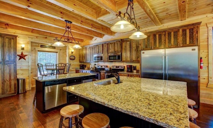 The Retreat cabin has a huge kitchen with granite countertops and 2 islands, 2 refrigerators (one downstairs), two dishwashers, two microwaves, large dining area, gas grill, expansive decks, 2 giant hot tubs, movie theatre, wifi, full size washer and dryer, multiple group seating areas, and more.