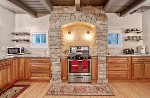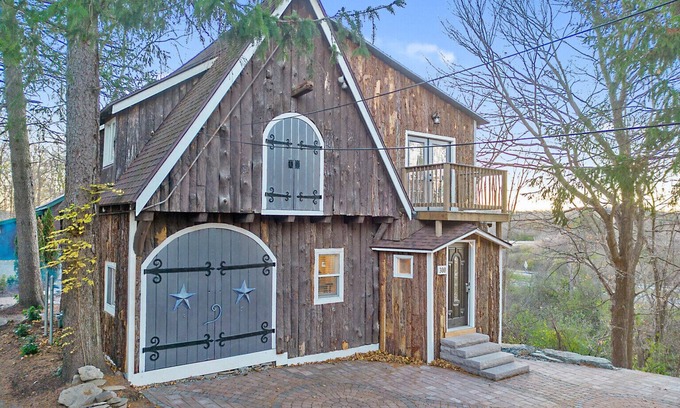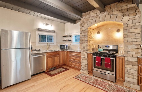 Picture yourself unwinding by a crackling fire on the custom patio. You may have trouble deciding if you want to spend your time outdoors or in, as the interior design is both thoughtful and comfortable, with a whimsical nod to Middle-earth and the Shire. The spacious living room features a large Roku TV and a gas fireplace that warms the space quite well! Entertain your group from our fully equipped kitchen and six top dining set. Book today!