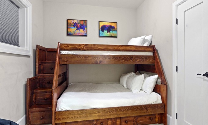 This 3-bedroom condo can accommodate up to 7 guests with a king-sized bed in the master bedroom, a queen-sized bed in the second bedroom, and a bunk bed in the third bedroom with a full-sized mattress on the bottom and a twin mattress on the top. There are two full bathrooms, with the master bathroom being private.