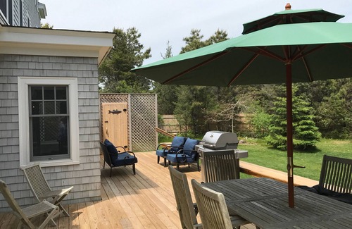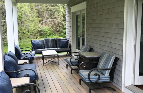 This newly completed 5 bedroom gambrel custom designed home has everything. The location allows a short walk to historic downtown Edgartown Village and a short drive to South Beach and other beaches. At the end of a private road, this home offers renters privacy. The yard and grounds are meticulously maintained. The outdoor decks and open covered porch allow for family gatherings and meals.