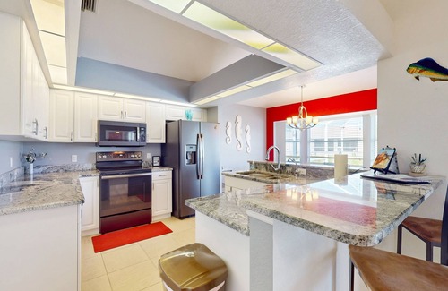 When you're ready to relax, head inside and sit down amongst the comfortable seating and large TV in the sun-filled living room. There's also a surround sound system throughout the home to enjoy your favorite playlists. When you aren't indulging in the area's local fare, play chef in the full kitchen while utilizing its stainless steel appliances and gleaming countertops. If you want to escalate your cooking, fire up the provided gas grill.