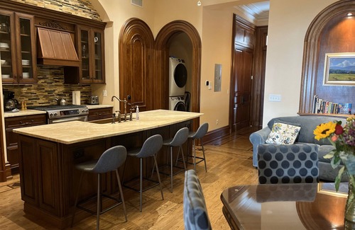Master bedroom features a king bed, double vanity marble bath, original marble fireplace, closet, and 50 inch TV. Beautiful kitchen features high-end appliances, marble counter-tops, large island, marble fireplace, and dining table. The Living room with 50 inch TV doubles as bedroom featuring a queen Murphy bed with 12 inch mattress, walk-in closet, and marble bath. Sleep another two people on the Pull out full couch in kitchen. Balcony out back features seating for 6 and is a quiet place to relax after a day exploring NYC and Jersey City.