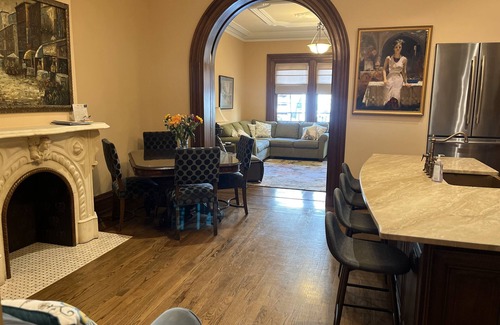 Lovingly updated, high-end, furnished brownstone apartment close to NYC available in beautiful downtown Jersey City from an experienced host. The apartment is a short walk to the train to NYC (PATH train from Grove Street). Dining, shopping, and Van Vorst Park are just steps away.