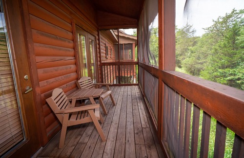 Enjoy your stay in this charming log cabin with a picturesque wooded view, nestled in the heart of Branson near the Highway 76 strip. The cabin offers two private bedrooms and two bathrooms, all situated on one level. Relax in the jetted tub of the master bathroom or on the private screened-in balcony. The comfortable living room features a gas fireplace, a queen-size sofa sleeper, and cable TV/DVD. With a full kitchen, dining room, and an in-unit washer and dryer, it's perfect for family getaways. Free wireless internet and outdoor pool access are provided during your stay.