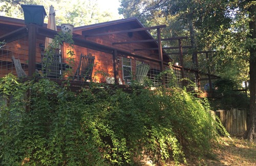 Charming rustic bungalow surrounded by a wooded ravine at Lake Sam Rayburn. The area is surrounded by Angelina National Forest. This home has open concept living, dining, and kitchen with 2 bedrooms and 1 1/2 bathrooms. Sleeps 6. The first bedroom has a queen bed and a full bed. The second bedroom has a queen bed. There is also a queen sleeper sofa in the living room.