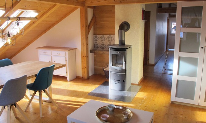 Enjoy your stay in our old farmhouse dating back to 1850. We always strive to preserve the charm of the farmhouse and to create comfort and style with modern elements. In the living room a wood stove invites you to linger. The conversion of the sofa can create two additional beds. The separate kitchen has a fridge with freezer, an oven with ceramic hob, dishwasher, complete dishes, pots, pans, toaster, kettle, coffee maker, a dining table with 6 seats. A highchair is available. The Feriernwohnung has 4 beds, a separate bathroom, free parking on site, free Wi-Fi, towels and sheets. Dogs are welcome.