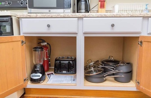 Kitchen features an oven/stove, refrigerator, and microwave. The kitchen is fully stocked for 6 with pots, pans, utensils, cups, wine glasses, etc. Plenty of countertop space for cooking and cabinets for food storage.