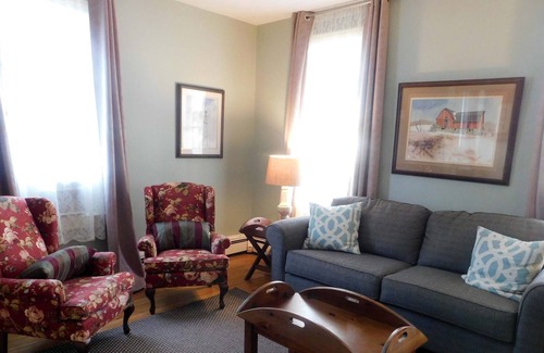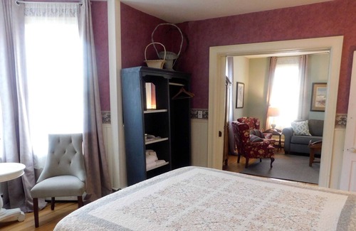 Vintage building with a coastal cottage feel offering new bedding & luxury linens, queen bed and queen sleeper. Ten foot ceilings. Small bathroom with tub, handicap bars. Mini-fridge & coffee maker. Smart TV with streaming services provided including Sling, Hulu & Netflix. Original wood floors. Large living room with queen hide-a-bed and bedroom. Private front porch looking out at the Mississippi River views. Gardens. 19th Century Building. Access to the Blue Door Inn's patio with barbecue gas grill & fire pit, great views and great gardens.