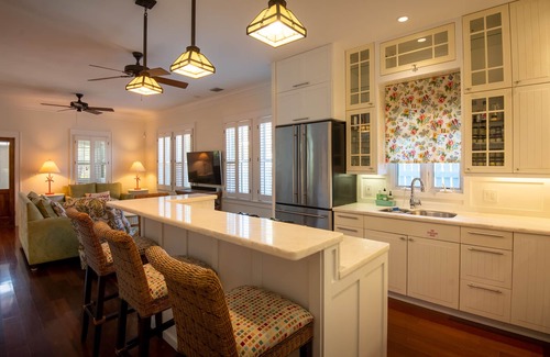 An adorable glance to your picture-perfect getaway catches your eye as you pull up to 2 off street parking with views of your long awaited dream home. A quaint sunroom begins your journey with seating for your 5 o’clock happy hour. Step foot into an attractive, open Great Room area with cozy furnishings, a flat screen TV and rich hard wood flooring throughout. A crisp, gourmet kitchen follows with ample lighted cabinetry, a gas stove, granite counters, stainless steel appliances and bar seating for 4. Dining for 6 lies just beyond overlooking your outdoor tropical oasis.