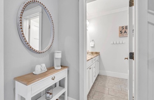 At the end of the hall on the second floor is the primary bedroom. This oasis features a king-sized bed, walk-in closet, ample seating area, luxurious master bath, and access to the second-floor wrap-around porch. Make a fresh cup of coffee in the Keurig located on the second-floor stair landing and sneak onto the porch to watch the sunrise! The primary bath features a Carrera marble walk-in shower with a Delta massage shower head and hand-held shower as well. The Cambria vanity features two vessel sinks, and the deep soaking tub is perfect for unwinding after playing with the kids on the beach all day.