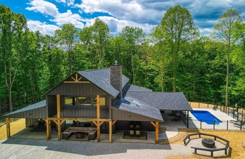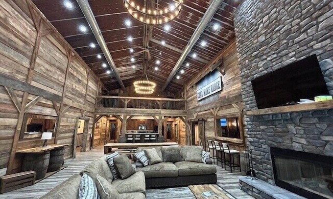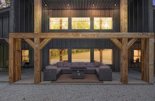 Hocking Hills' first lodge with Duck Pin Bowling! This newly-constructed, barn-style pool lodge has it all! With a nod to local history, Coal Mine Ridge pays tribute to an 1800's era when coal mining was life! Attention to detail and historic decor carries throughout the house with antiques and custom barnwood furniture and cabinetry in every room. The great room, which lives up to its name, boasts 40+ ft ceilings and Ohio-sourced, vintage barnwood. There is even an incredible game room with the Hocking Hills' very first state-of-the-art "coal mine" 2 lane duck-pin bowling alley! Outside you will find expansive covered patios with outdoor seating and a seasonal in-ground swimming pool- open Memorial Day-Oct 1st (optionally heated). Coal Mine Ridge can also be rented with Tranquility Ridge, Water's Edge, Hideaway, Secluded and Sterling Lodge within walking distance to accommodate 45+ people.