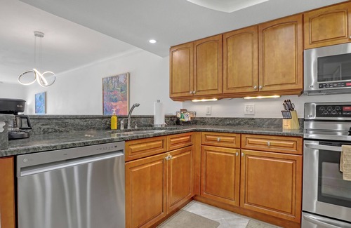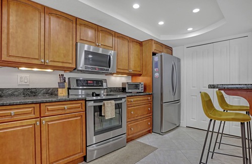 The kitchen, with its warm wooden cabinetry and sleek, dark countertops, comes fully equipped with stainless steel appliances and a convenient breakfast bar adorned with vibrant yellow stools—a cheerful spot for morning coffee or a casual bite.