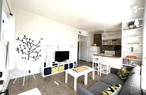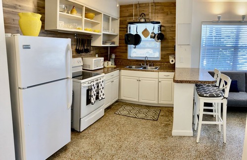 Located two short blocks away from the beach, bars and restaurants. The open floor plan flows from living room to kitchen, and is tastefully decorated in grey and yellow. The living room features a new sofa sleeper for additional sleeping and a SMART TV.