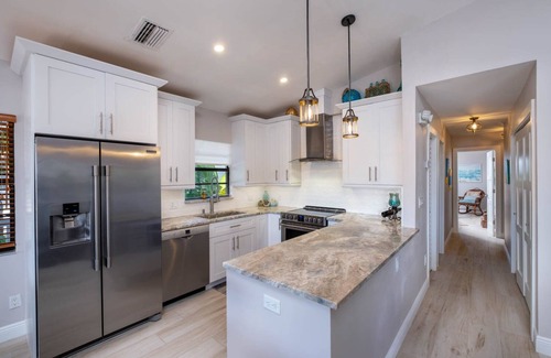 This designer REMODELED IN JULY 2021 3bdr, 2bath home is located on a 60 foot deep water dock in quiet Plantation Key, Florida. This charming vacation home was decorated by an interior designer . The home features a screened in porch, wrap around balcony, sun deck and upper porch for relaxing with a glass of wine or a fine book while watching the birds from the nature preserve flying by. the large travertine deck has a 6 person new luxurious jacuzzi hot tub overlooking the water. The moment you set your foot in the door-you know and feel that you are on vacation, and time stops still....